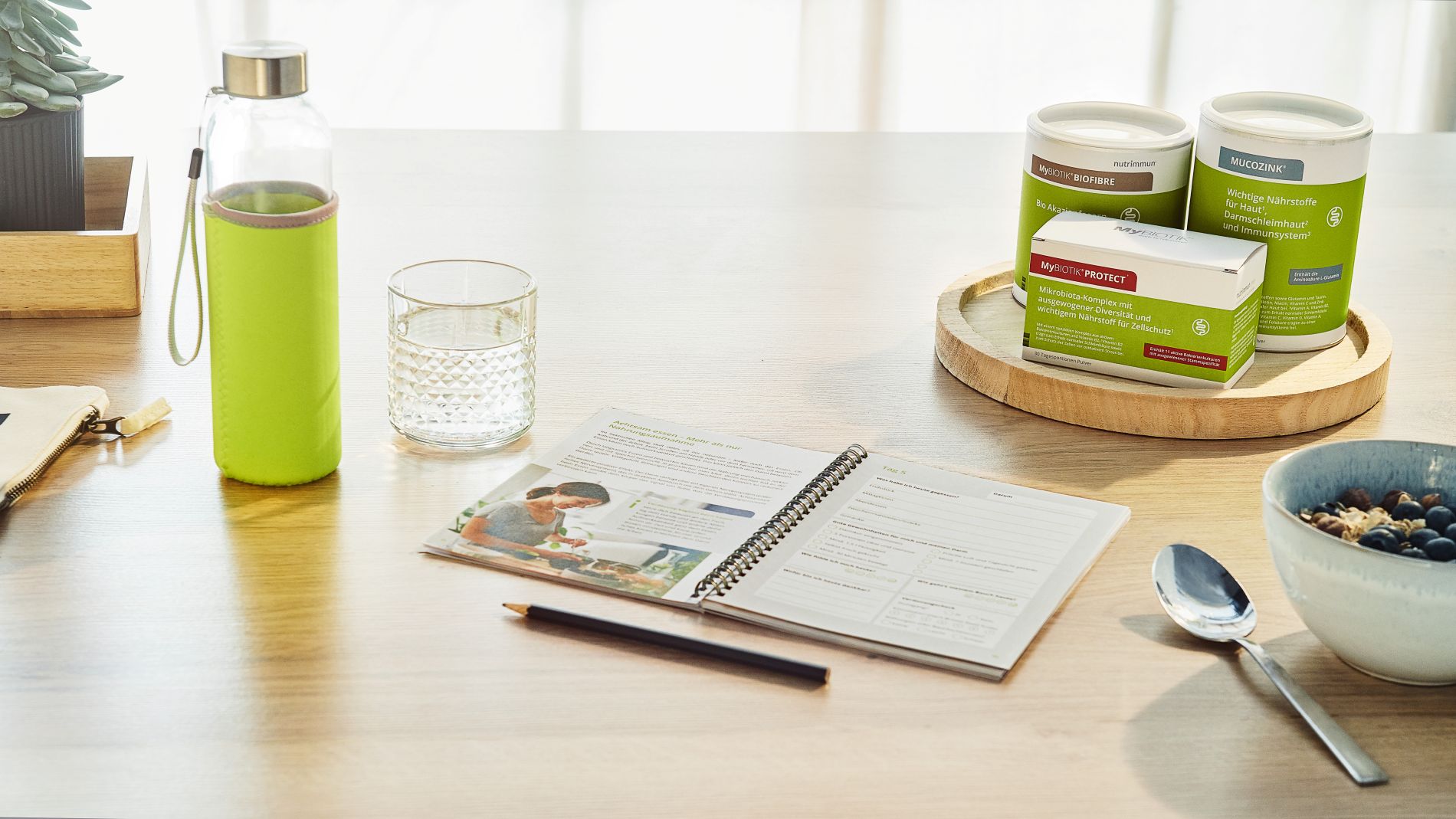 Starte z.B. morgens vor dem Frühstück mit einem Glas stillem Wasser, in das du MyBIOTIK®PROTECT einrührst. Du kannst gleichzeitig auch MyBIOTIK®BIOFIBRE in das gleiche Glas einzurühren.